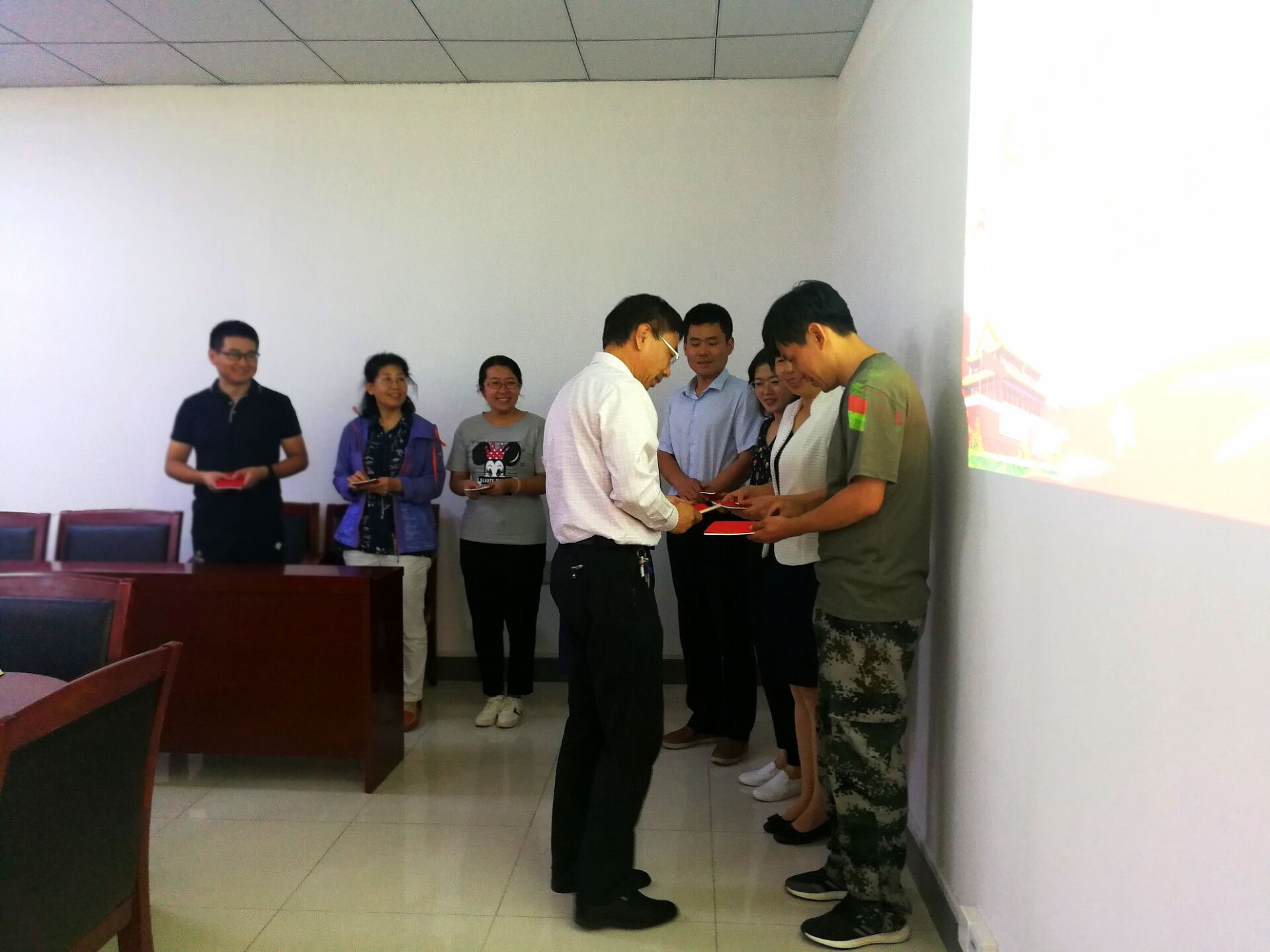 冯宝鹏为支部党员发放党章、党徽