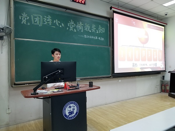 活动伊始,能动1901团支部书记马胜祥介绍了活动流程。然后,冯文创同志为大家详细介绍了共产党的历史使命等相关信息以及入党发展流程,同学们认真学习了冯的讲解并提出问题,冯详细回答了新生们的问题。随后,袁晶同志讲述了自己进入大学两年多来的员工工作经验,其播放的“点赞中国”手指舞视频也让大家受到吸引。在讲解中,“如何进行员工工作”,“如何做好员工工作”等问题也迎刃而解。结束时,袁感慨道:“虽然团支书的职务我只担任了一年,但这让我收获颇丰,参加员工工作也是老员工活极为重要的一部分!”接下来,陈亚春同志给大家进行了能动专业的专业介绍,为19级的新生上了关于专业认识的一堂课。而后,杨耀钧、杨程翔、辛宇、李豪等同志分别为大家分享了保研经验,让新生对于未来的方向与脚下的路有了更明确的规划。最终由能动1902团支部书记王恩礼进行了活动总结,活动圆满结束。
