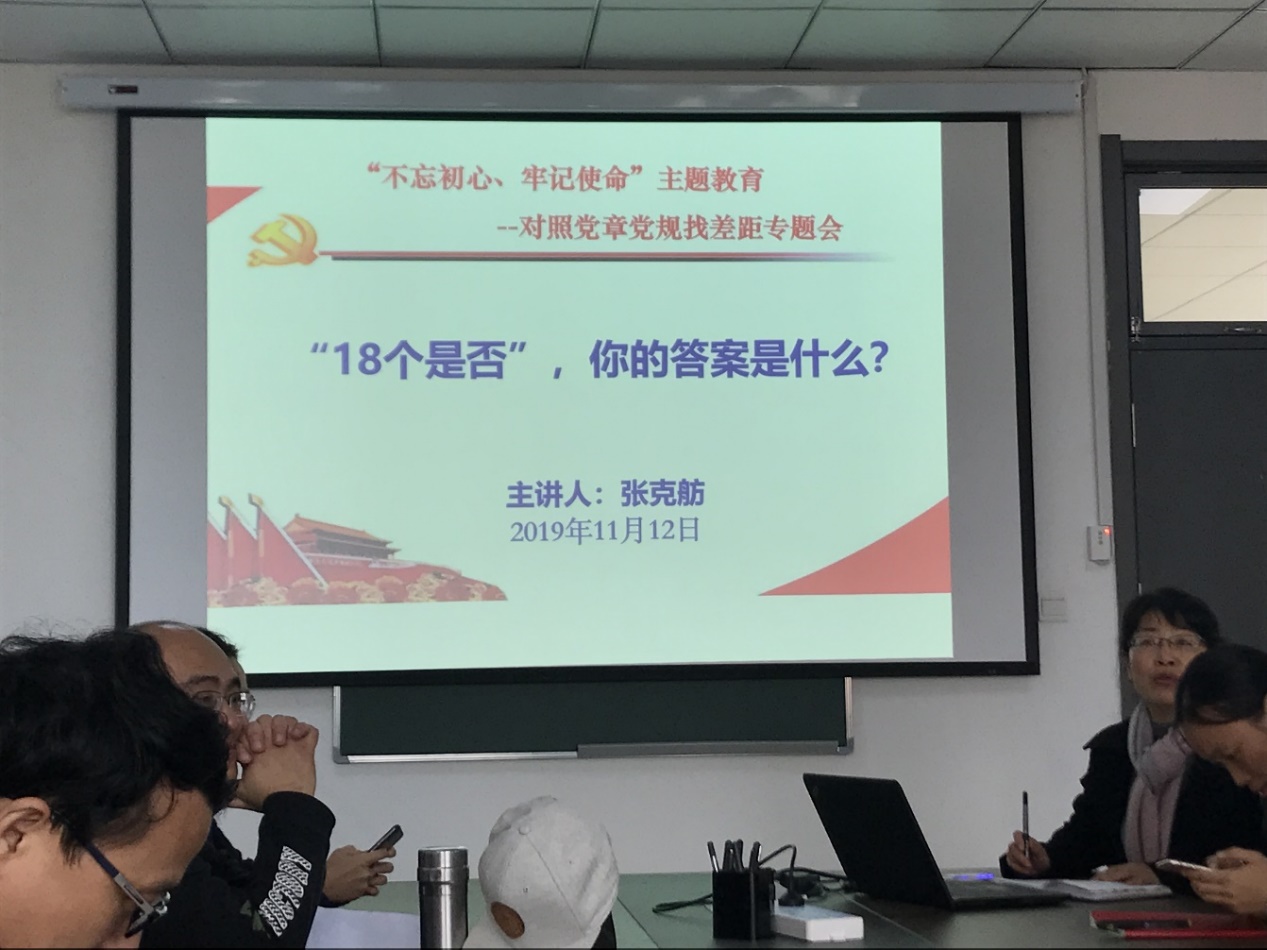 张克舫对照“十八个是否”带领党员同志逐条检查找差距,支部党员从生活、教学、科研等方面,展开批评与自我批评。张克舫书记强调了本次学习和查摆的重要意义,要求各位党员会议结束后要仔细梳理,对照问题清单,及时整改。参会党员表示,要脚踏实地做好本职工作,甘于奉献,严于律已,不忘初心、牢记使命,在平凡的教学和科研岗位上,创造出不平凡的成绩。