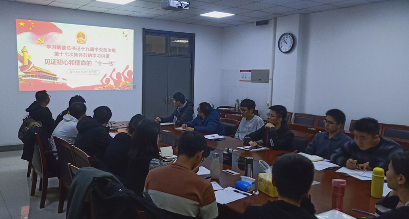 会议伊始,支部宣传委员王寅介绍了本次组织生活会流程。本次组织生活会第一项主题是“学习解读总书记十九届中央政治局第十七次集体学习时的讲话”。首先,全体党员同志一同回顾了总书记讲话,给出四个“制度是”。随后,全体党员同志根据总书记的讲话内容,对“中国特色社会主义制度”、“中国制度故事”、“国家治理体系和治理能力现代化”这三个关键词进行了讨论。深入讨论了我党的制度优势以及国家治理体系的发展以及治理能力的现代化。最后支部宣传委员王寅给出总结:“在新形势下,我们要做到坚持好、巩固好我国当前的制度优势,同时我们也要继续加强制度创新。”本次组织生活会的第二个主题是“见证初心和使命的‘十一书’”。首先,全体党员同志一同观看视频《见证初心和使命的“十一书”》微纪录片主题曲,回顾十一位共产党人的奋斗故事。之后,党员同志自由讨论,针对一个故事做简单的介绍并发表感悟。之后,支部大会经大家讨论后总结到:在现在这样一个和平年代,我们作为共产党员,要深入学习那11名烈士的精神,继续“不忘初心、牢记使命”。随时准备为党和国家牺牲一切。
