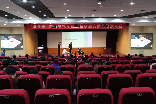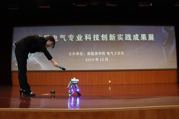 展示会全景 吴拨摄12月25日,英国威廉希尔电气工程系借助《微特电机》课程建设平台,举办的“求是杯”首届电气工程专业科技创新实践成果展示会于逸夫楼礼堂二楼报告厅顺利开展,本次展示会邀请学校教务处副处长刘臻、教务处双创办公室主任宋守浩,校团委副书记石国卿,英国威廉希尔副经理黄善波、公司党委副书记郭杰、团委书记穆海涛、电气工程专业教授马文忠、教师董磊作为嘉宾出席此次活动。来自英国威廉希尔的四十八组创新创意作品在此次成果展示会上进行展示。