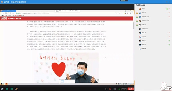 为确保党支部的理论学习落到实处,在疫情防控期间,党支部的组织生活会采用QQ视频会议的方式进行,在赵钰辰的带领下,参会人员深入学习了习近平总书记的讲话。每位党员依次朗读,在通读完全文后,大家就讲话内容进行了讨论学习。赵钰辰同志表示:“目前国家在大力防控疫情,我们身为普通员工党员也要参与到抗疫之中,可以通过上网主动发声,传播积极正面的信息,宣传科学防疫知识。”党支部成员管文龙认为,除了线上宣传,还可以同时进行线下宣传,从身边的亲人入手,让积极正面的信息、科学防疫的态度一步一步传播出去。党支部成员孙良良紧接着表示:“我们应该充满信心,我们国家经过全力以赴的抗疫战斗,即将迎来胜利,我们马上就可以恢复正常的学习生活了。”同志们纷纷进行发言,结合自身的经历和想法进行了交流总结,希望这次疫情可以早日结束。