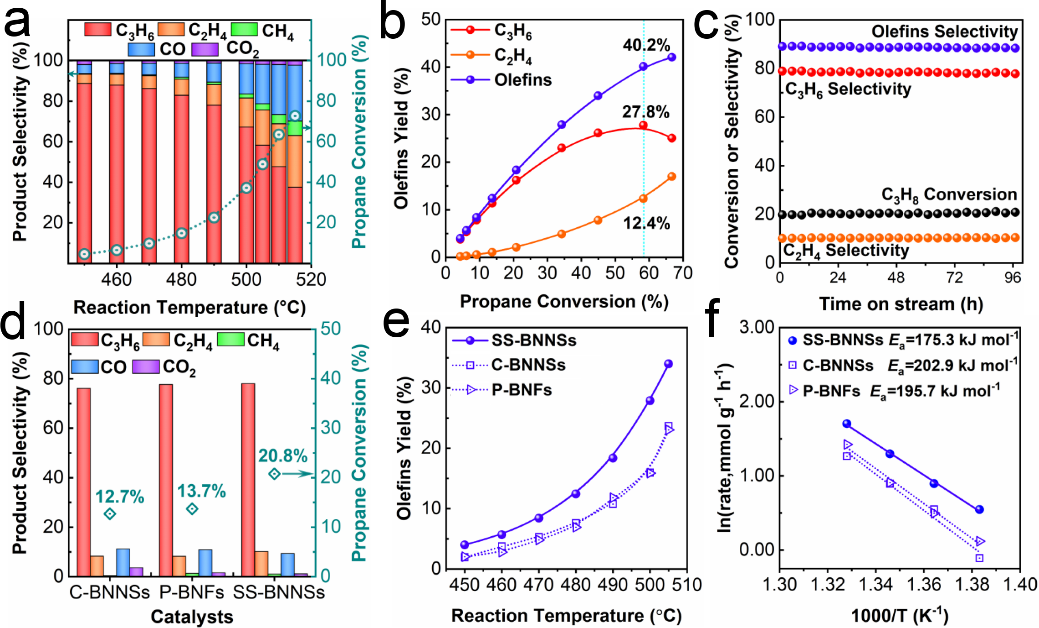 SS-BNNSs在丙烷氧化脱氢反应中表现出了优异的催化性能,510 ºC的操作温度下,产物中烯烃的收率达到40.2%(丙烯,27.8%;乙烯,12.4%),远超商业化的氮化硼纳米片(丙烯,23.8%;乙烯,8.6%)和高比表面积的氮化硼纤维(丙烯,20.7%;乙烯,10.2%)。通过系统的表征可以发现,SS-BNNSs表面富含B-OH,让催化剂无须活化就可以直接催化反应进行,同时特殊的结构优势提高了活性物种的分散度,利于反应气与活性位点快速接触和产物丙烯的迅速脱附,提升了产物丙烯的单程收率。SS-BNNSs自组装的构造过程和结构优势带来的性能提升拓宽了催化剂的设计思路。
