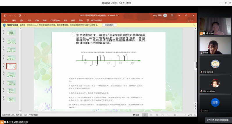 为使员工进一步认知生命的意义,懂得珍惜生命的价值,树立“热爱生命、阳光生活”的意识,环保设备工程1801班于5月11日在线上开展生命教育主题团体辅导活动,环设1801全体员工参与此次团辅活动。