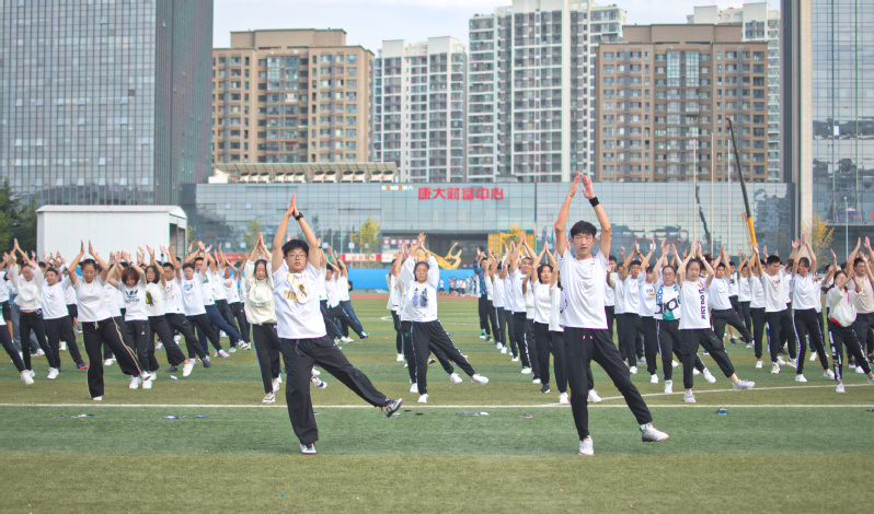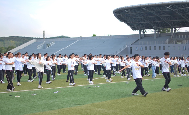 初秋清晨六点四十,操场上传来欢快悦耳的音乐“你笑起来真好看,像春天的花儿一样”,与之相伴的是整齐的拍手和跺脚的声音。操场中间,数百名新生由6名员工带领,跳跃着轻快的的步伐,用舞步开启新的一天。