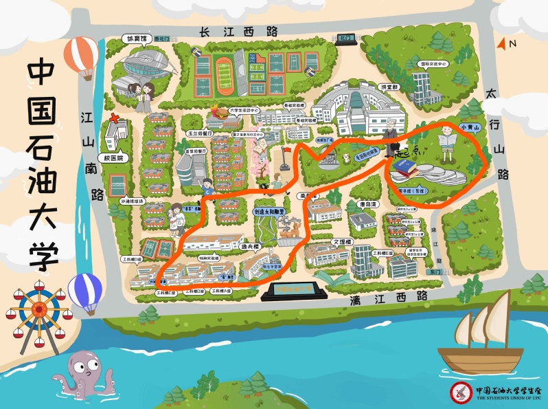 3、活动路线:16:15在新图书馆大门前集合完毕后出发,绕校园后返回(路线如下图所示),在新图书馆大门前集体合影留念结束。