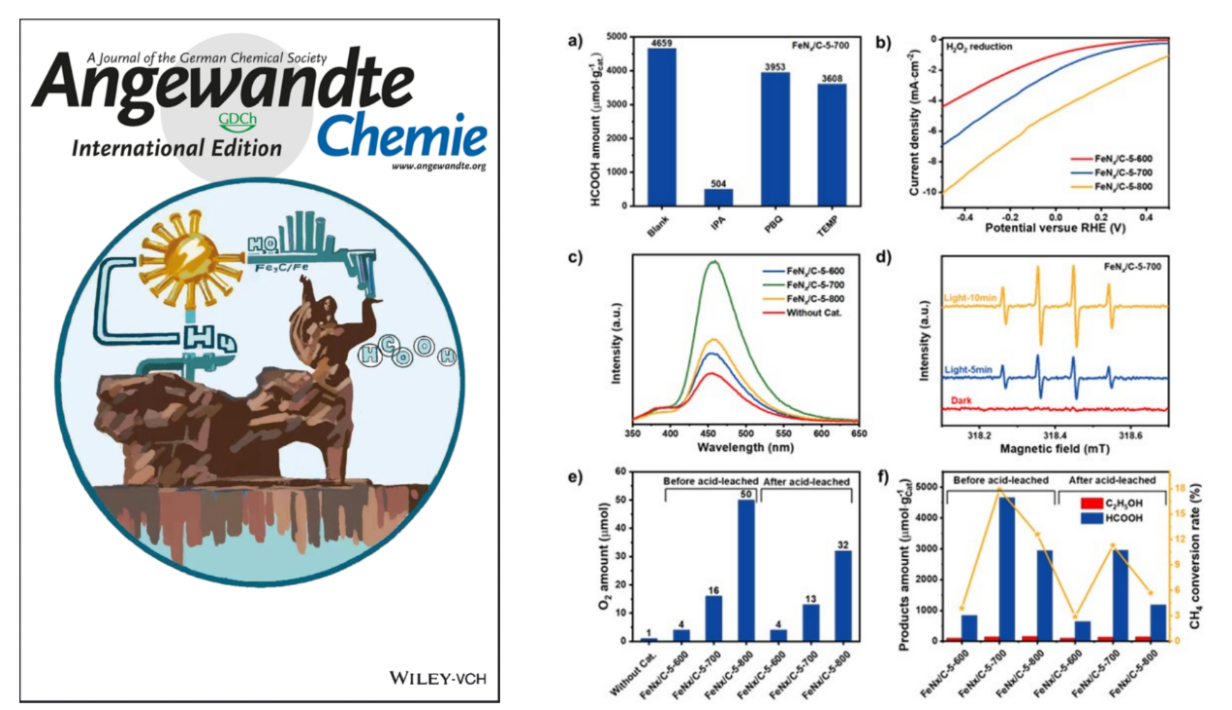 题为《Fe/Fe3C提升H2O2利用,实现甲烷转化抑制 O2生成》(Fe/Fe3C Boosts H2O2 Utilization for Methane Conversion Overwhelming O2 Generation)的成果发表在化学领域顶级期刊Angewandte Chemie International Edition上,并被选为封面文章,公司2018级硕士研究生邢毅成为第一作者,吴文婷教授和吴明铂教授为共同通讯作者。