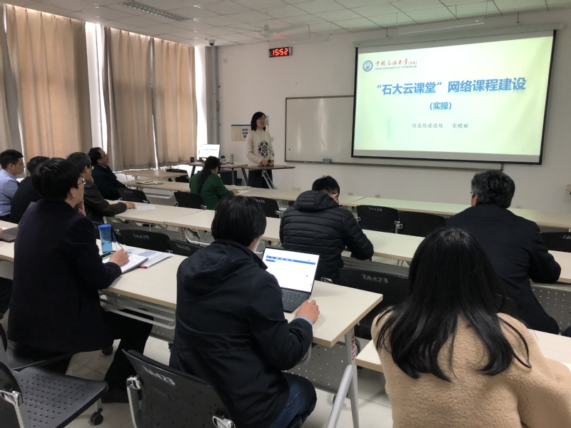 黄善波介绍了全部课程上网计划的目的、任务和工作要求。信息化建设处宋晓丽老师对如何在“石大云课堂”上建设课程进行了实操培训,向与会老师详细介绍了平台的新增功能,并对老师们提出的平台使用问题进行了现场解答。