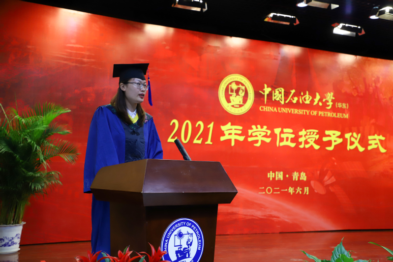 尹宏、董雪梅分别代表2021届本科毕业生以及研究生毕业生上台发言,尹宏表示:“毕业是大学四年的精彩谢幕,更是下一段征程的郑重开始。”希望毕业生们在将来能够带着学院的期望,不忘初心,强国筑梦。“希望各位同学在练就过硬本领的过程中把青春小我融入到国家大我,把理想追求融入到一件件具体的工作中去,在实现中国梦的伟大实践中放飞青春梦想。”董雪梅如是说。