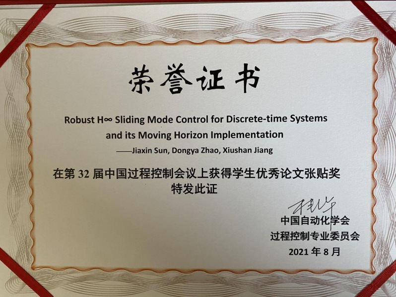 公司孙甲新硕士研究生、赵东亚教授和蒋秀珊博士合作的论文“Robust H∞ Sliding Mode Control for Discrete-time Systems and its Moving Horizon Implementation”获2021年第32届中国过程控制会议(CPCC2021)员工优秀论文张贴奖。