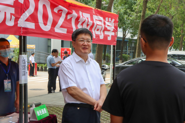 在迎新现场,王勇与新生亲切交谈,了解新生情况,遇到正在办理报到手续的新能源科学与工程专业新生刘青鑫,在得知他来自滨州,理想专业正是新能源专业,且高中时就一直向往来到石大读书时,王勇寄语刘青鑫“石大是一个更高、更广的学习平台,学校制定一系列政策保障和鼓励员工全面发展,在大学期间要努力学习专业课程,关注和了解新能源行业的发展,尽快成长成才,用所学知识回馈社会和母校。”“听了老师的嘱托,我一定会继续努力,成为更加优秀的自己!”来自新能源科学与工程专业2021级新生刘青鑫激动地说到。