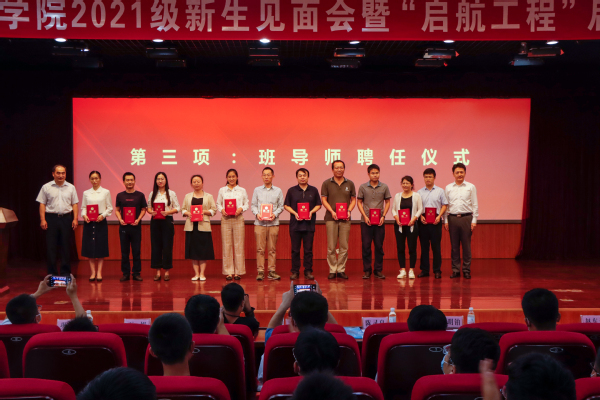 陈灵泉、吴明铂为2021级班导师颁发聘书。班导师代表万娱发言,她从“明确的目标”“扎实的学识”以及“不懈的奋斗”三个方面阐述了自己对于坚守初心的见解。希望新生们能够走出舒适区,规划自己的人生方向,志存高远、精进向前。