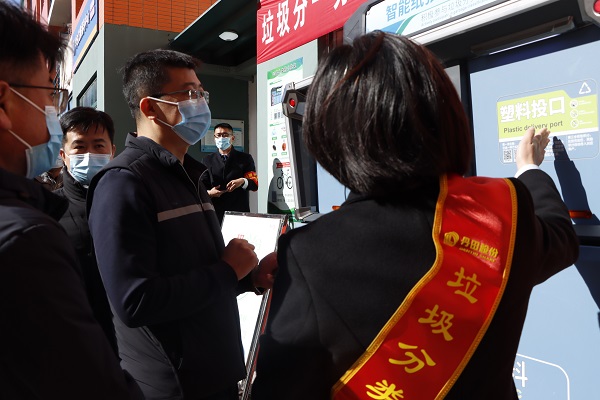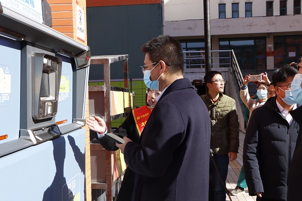 党委员工工作部(武装部)部长王林 体验垃圾分类投放箱 杨新宇摄
