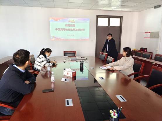 会议首先由王新伟老师做题为《教育强国—中国高等教育改革发展历程》的微党课,回顾了我国高等教育自建国以来的改革发展历程。70多年以来,我国高等教育经历了数次调整:配合国家“一五计划”,1952年到1957年开展院系大调整;1977年恢复高考,炸响了改革开放的第一声春雷;1998年高校扩招,更多的人获得了上大学的机会;党的十八大以来,考试招生制度改革、双一流、振兴本科教育……一批标志性、引领性的改革举措成效凸显。我国高等教育扎根中国大地,为国家图富强,为民族谋复兴,为社会育人才,始终与共和国同向同行。