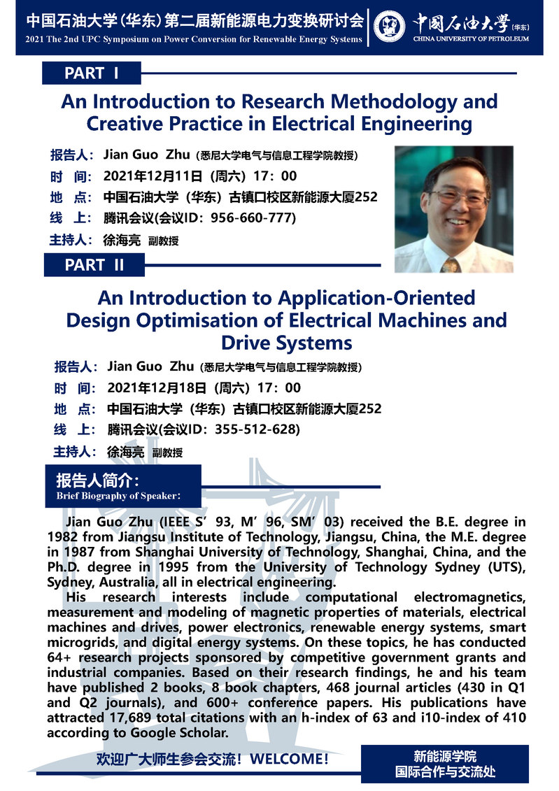 关于第二届新能源电力变换研讨会之悉尼大学Jian Guo Zhu教授讲座的通知