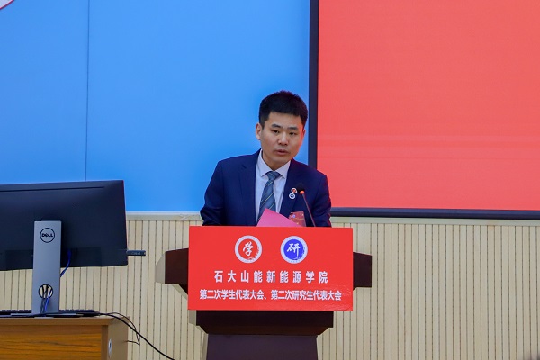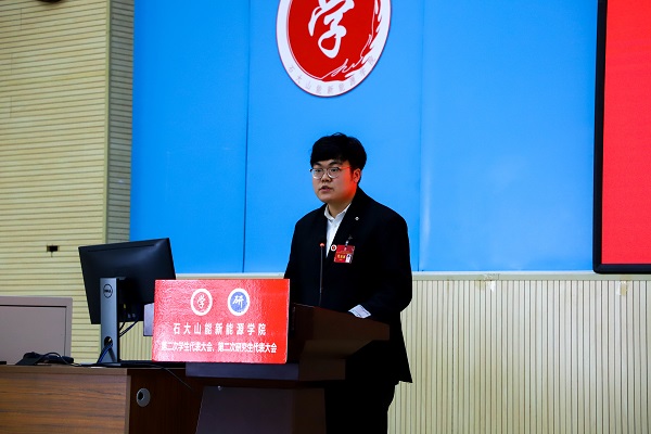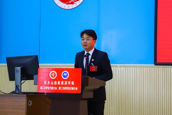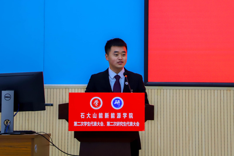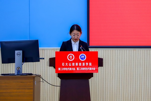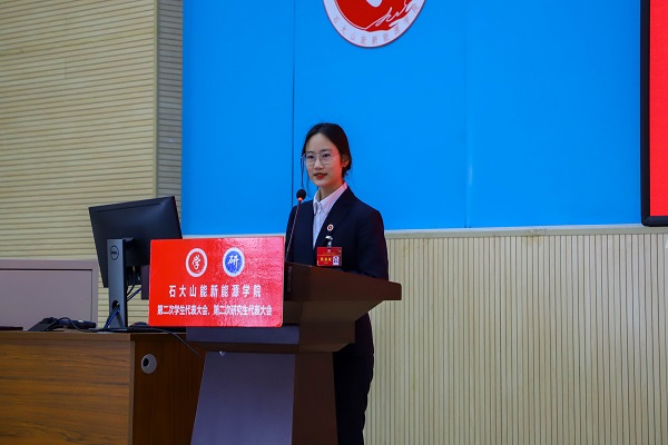 李玥嬛代表学院研究生会作题为《传承石大精神、勇担强国使命、为建设有更多能源学科特色的高水平研究型学院而奋斗》的工作报告。研究生会要始终把全心全意为广大同学服务,作为一切工作的出发点和落脚点。将继续努力维护研究生的权利,真正反映研究生呼声,代表研究生利益。从科研、文体、生活等方面入手,广泛听取研究生同学的意见,进一步优化服务的质量。努力做好权益维护工作,广泛开展反馈渠道,收集、反馈员工意见,为建设更美好的古镇口校区新家园不懈努力。