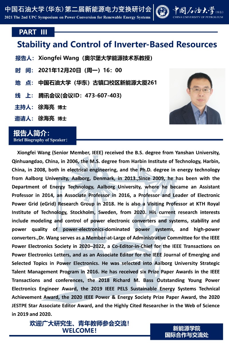 关于第二届新能源电力变换研讨会之丹麦奥尔堡大学Xiongfei Wang教授讲座的通知