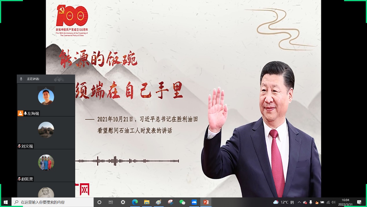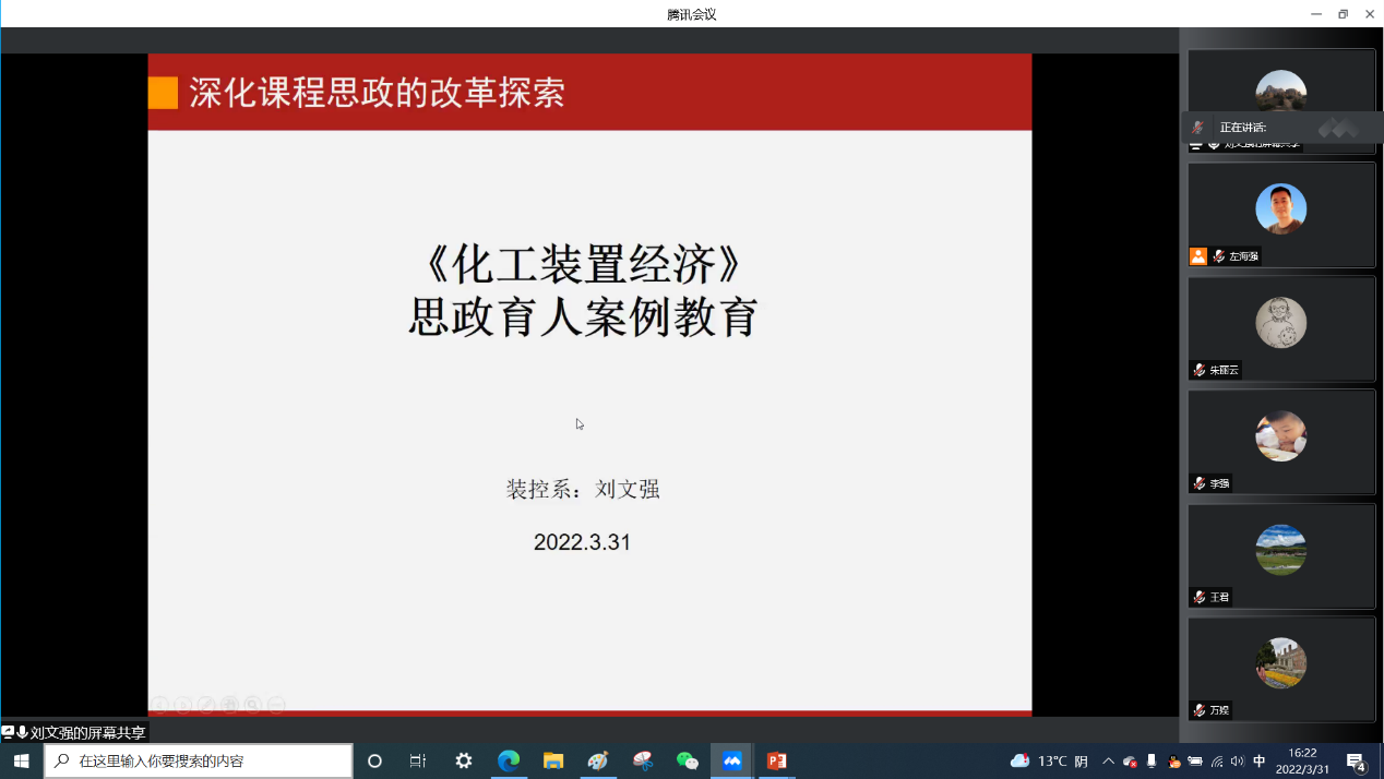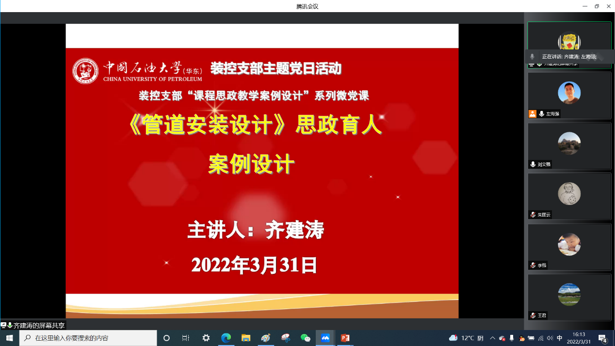 首期由左海强、齐建涛、曲燕和刘文强四位老师进行课程思政教学案例设计分享。左海强老师以《过程设备设计(2-2)》思政育人案例设计为题进行介绍,课程绪论部分引入习近平总书记2021年10月21日在视察胜利油田时的讲话:“能源的饭碗必须端在自己手里”鼓励同学们努力学习本领,以科技创新开发石油化工高端装备,提升石油能源利用效率,高质量端好能源的饭碗。在存储设备章节将国家战略石油储备如何服务国家能源安全等思政元素有机融入课堂教学。齐建涛老师以《管道安装设计》思政育人案例设计为题进行介绍,课程中将大连新港“7·16”石油管线爆炸救援中的消防战士桑武冒着生命危险毅然冲入爆炸不断的火场中心,忍着灼烧的剧痛徒手将阀门转了32000圈最终关闭泄漏原油的储油罐阀门,创造我国火灾扑救史上的奇迹这一案例有机融入课堂教学。曲燕老师以《传热强化技术》思政育人案例设计为题进行介绍,课程中将中国力争2030年前实现“碳达峰”, 2060年前实现“碳中和”,鼓励同学们抓住新能源变革机遇,永葆“热”情,攻坚克难,建功立业这一思政元素有机融入课堂教学。刘文强老师以《化工装置经济》思政育人案例设计为题进行介绍,课程中将中国石油化工发展历史、一带一路等思政元素有机融入课堂教学。四位老师的分享给了老师们很大启发,其余老师也对四位老师讲解的思政育人案例中如何更好的融入思政元素提出了更多有价值的建议。
