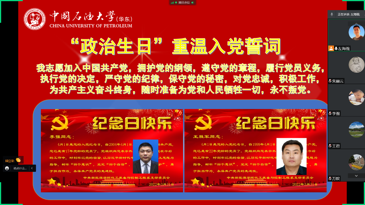 接下来,支部向迎来“政治生日”的李强和王胜军两位同志表示祝贺,支部书记左海强为两位同志发放了贺卡,两位同志带领全体党员重温了入党誓词。