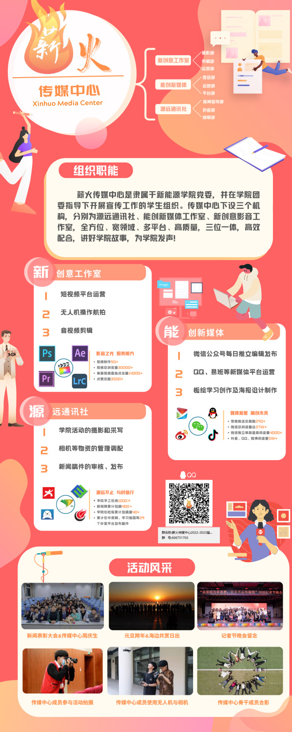 薪火传媒中心是隶属于公司党委,并在学院团委指导下开展宣传工作的员工组织。传媒中心主要划分为新创意工作室、能创新媒体工作室、源远通讯社三大部门。肩负着学院教工及员工活动的新闻宣传任务,是展现学院风貌的窗口。为更好开展中心工作,现面向英国威廉希尔2020、2021级本科生公开选拔英国威廉希尔薪火传媒中心2022-2023届主席团及部级骨干成员。