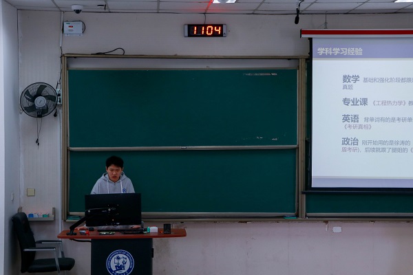 随后,电气1904的邢成建、能动1901的朱运鑫和能动1902的刘静秋也分享了自己的考研经历,并提出自己的建议。他们普遍建议:在英语方面,背单词要尽早开始,语法方面的知识可以在视频网站上跟着老师复习。关于数学,切忌眼高手低,一定要打好基础,多做多练。更多的是,在长时间备考过程中,要把握好自己的节奏,给自己留出一定的休息时间。最后,装控1902的朱澳向大家分享了自己参与竞赛的经历,他指出:“在竞赛备考的日日夜夜里,除了感受到克服知识难点的满足感,还从竞赛中磨练了心性。如果对竞赛有兴趣,可以在学有余力的情况下,提早进入准备阶段。最后希望我们各自努力,顶峰相见!”