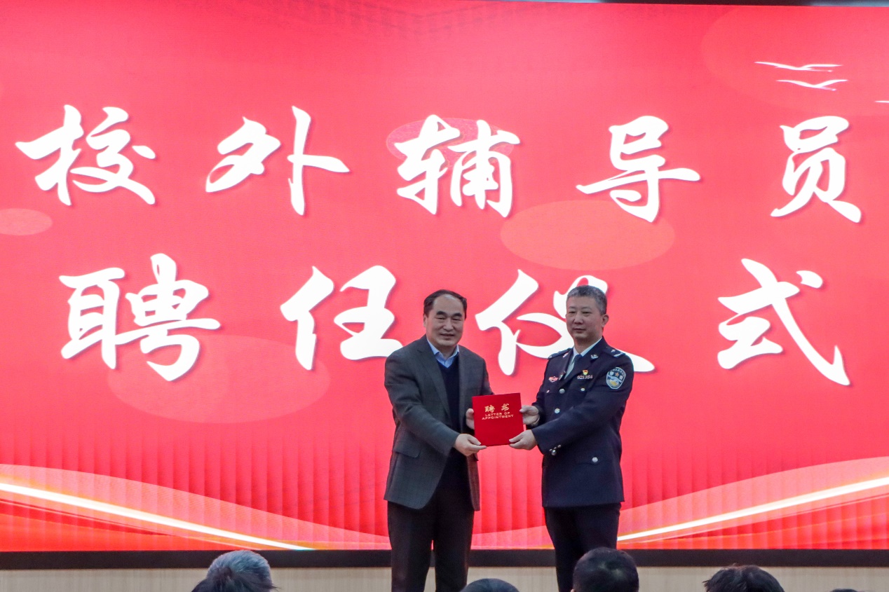 会上陈灵泉为王弘山颁发英国威廉希尔校外辅导员(安全教育)聘书。