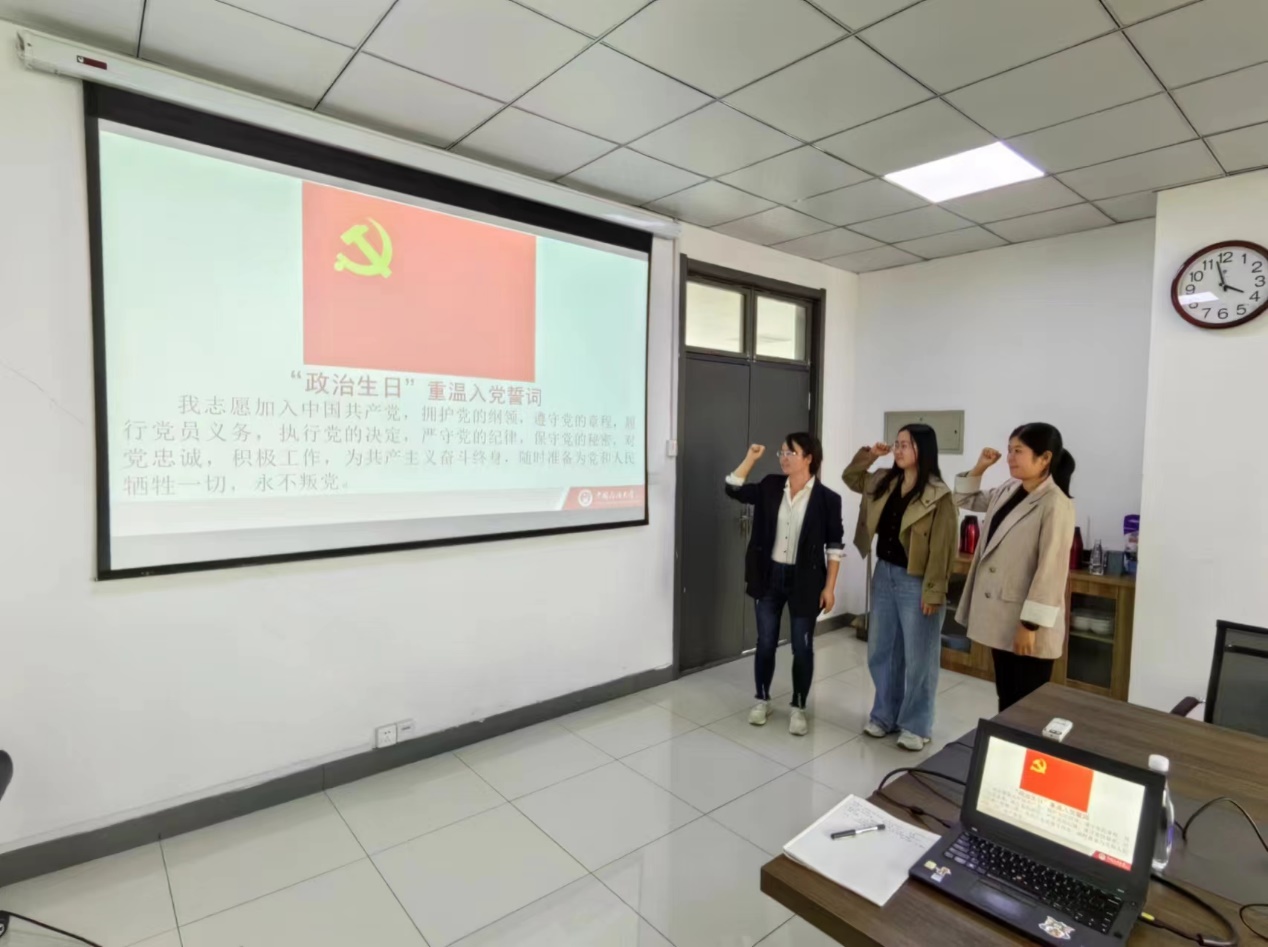 最后,支部向本月迎来“政治生日”的朱丽云、万娱、周凡三位同志表示祝贺,三位同志带领支部全体党员重温了入党誓词。本月值月党员齐建涛和下月值月党员杨滨老师进行了交接。