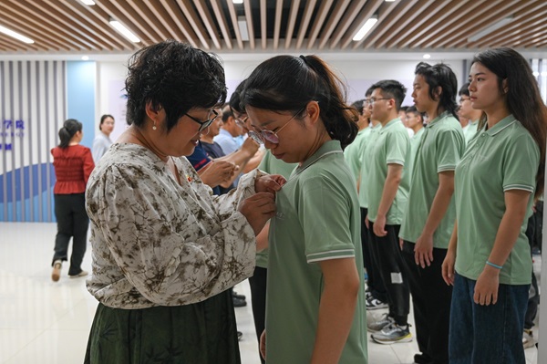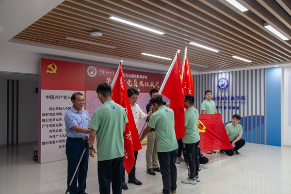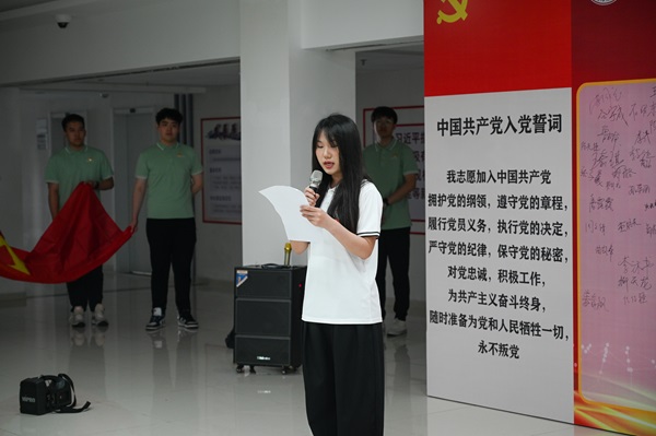 吴明铂、郭杰、张洪泉为2024届毕业生优秀党员代表新能源2001班高彦文、能动2003班德勒多吉、环设2002班高晓授旗,开启人生下一个阶段。授旗结束后,在场老师为所有党员郑重佩戴党徽,一枚党徽寄托着学院对毕业生的殷殷嘱托和无限期望。全体毕业生党员站在党旗前庄严宣誓,重温入党誓词,一字一句都深深印刻在每位党员心中,作为指引前行的灯塔。