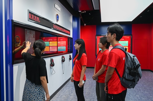 在防诈骗展区,实践队员贺小凡通过展示真实案例和互动题库,进一步了解诈骗的常见手法和防范措施。在党建方面,展区构建VR模型,让队员们能够身临其境地感受党的光辉历程和伟大成就。通过操作智能平台,实践队员们身在社区就可以云游览著名红色景区,学习红色历史。同时,平台还制作了中国共产党文化、新中国文化等建模展览,并配以专业的语音讲解,为实践队员们提供了一场深刻而生动的党性教育。