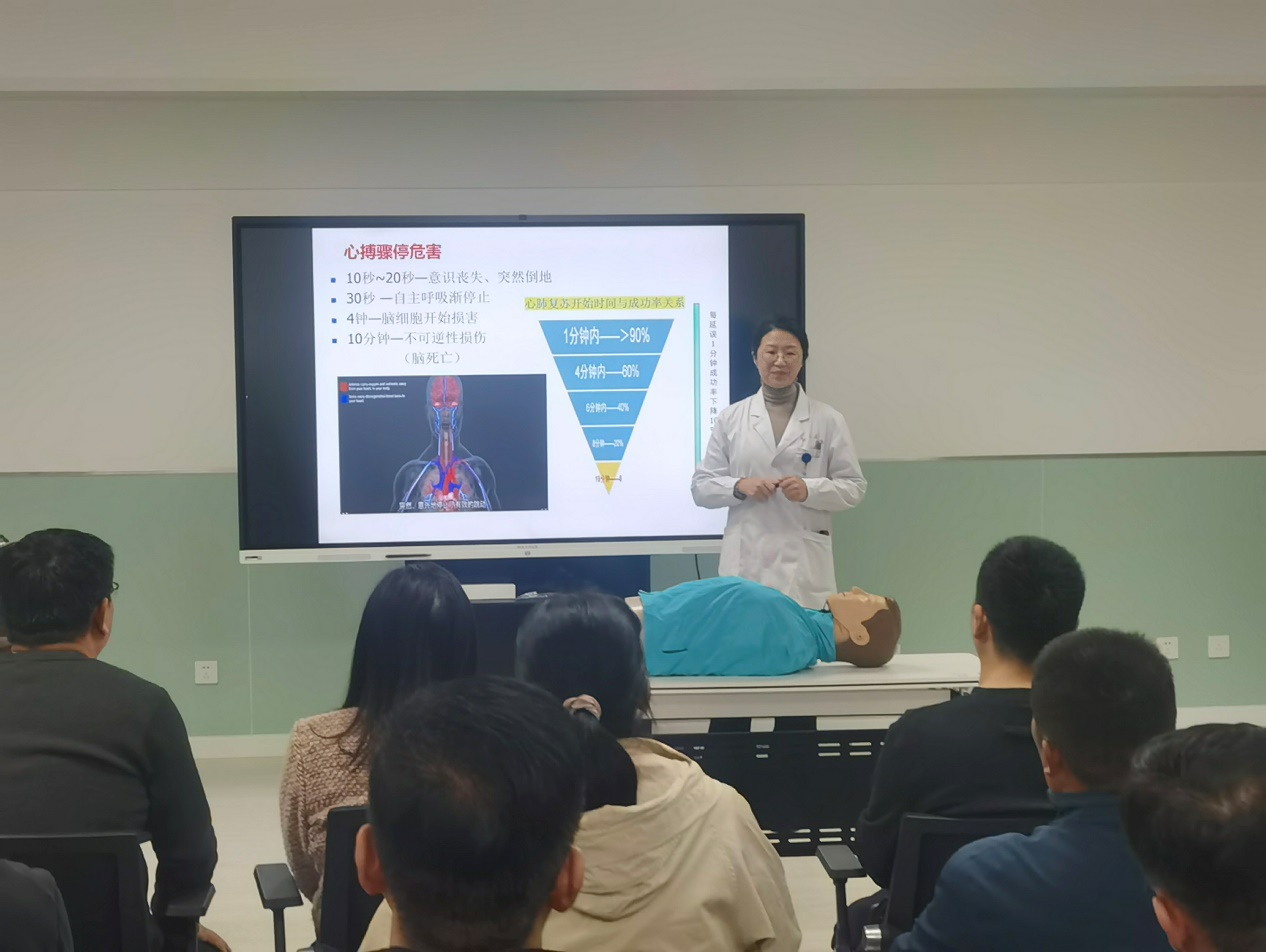在培训过程中,校医院医务人员进行了专业、严谨且精彩的讲解与演示。培训内容涵盖了急救基础理论知识、心肺复苏(CPR)技能、自动体外除颤仪(AED)使用方法以及海姆立克急救法等重要内容。党员们认真听讲,积极参与现场演示和模拟操作,通过医务人员的悉心指导,逐一进行练习展示,并接受了正规程序的考核,确保每位党员都能掌握正确的急救技能。