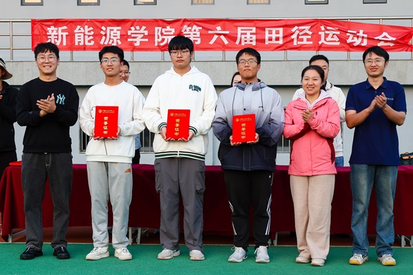 在绿茵场上,激情与活力交织,运动员们以坚韧不拔的意志,投身于一场场紧张刺激的竞技之中。赛道上,他们如风般疾驰,汗水与决心交织成一幅幅动人的画面;在投掷区,运动员们凝神聚气,力量在肌肉中蓄势待发,铁饼、标枪、铅球划出一道道美丽的抛物线;跳远沙坑旁,运动员们腾空而起,留下一串串飞跃的足迹。场边,观众们的欢呼声此起彼伏,裁判员们严格按照规则,公正无私地裁决每一个动作,确保了比赛的公平性和透明度。经过一轮轮角逐,最终在团体积分排名中,2024级能动代表队获金牌,2024级电气代表队获银牌,2024级环设代表队获铜牌。最后,学院全体辅导员为获奖团体和个人进行颁奖表彰并合影留念。