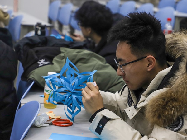 活动开始,由剪纸爱好者协会负责人王牧晗为参与活动的员工介绍剪纸的历史和文化背景,并教授了本次剪纸体验互动的作品制作流程,即使用提供的彩纸和剪刀、刻刀等工具,制作与大雪节气十分相称的“纸雪花”。完成雪花作品制作后,员工依次领取白色卡纸,挑选不同色彩的彩笔来绘制大雪、冬日主题的画作,留作纪念。活动过程中,员工利用手头材料,两人一组,积极协作,纷纷制作出了属于自己的剪纸作品,不少员工在卡纸上完成了属于自己的画作。在活动最后,参与活动的员工们互相展示自己的作品,大家一起合影留念。活动结束后,员工会成员王昱皓表示:“本次活动选在大雪这个节气,形式为传统的剪纸艺术,具有浓厚的文化气息,旨在让同学们在繁杂的学习生活中收获到一份平静。”