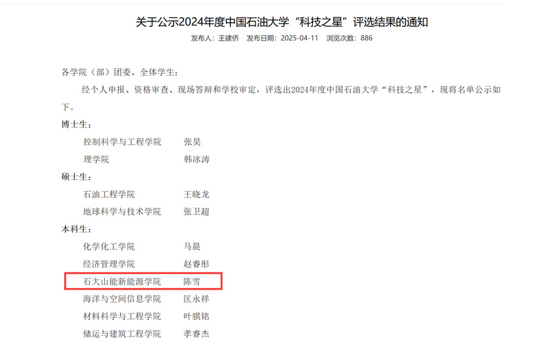 近日,2024年度中国石油大学“科技之星”评选结果揭晓,公司储能2201班陈雪获评“科技之星”荣誉称号。