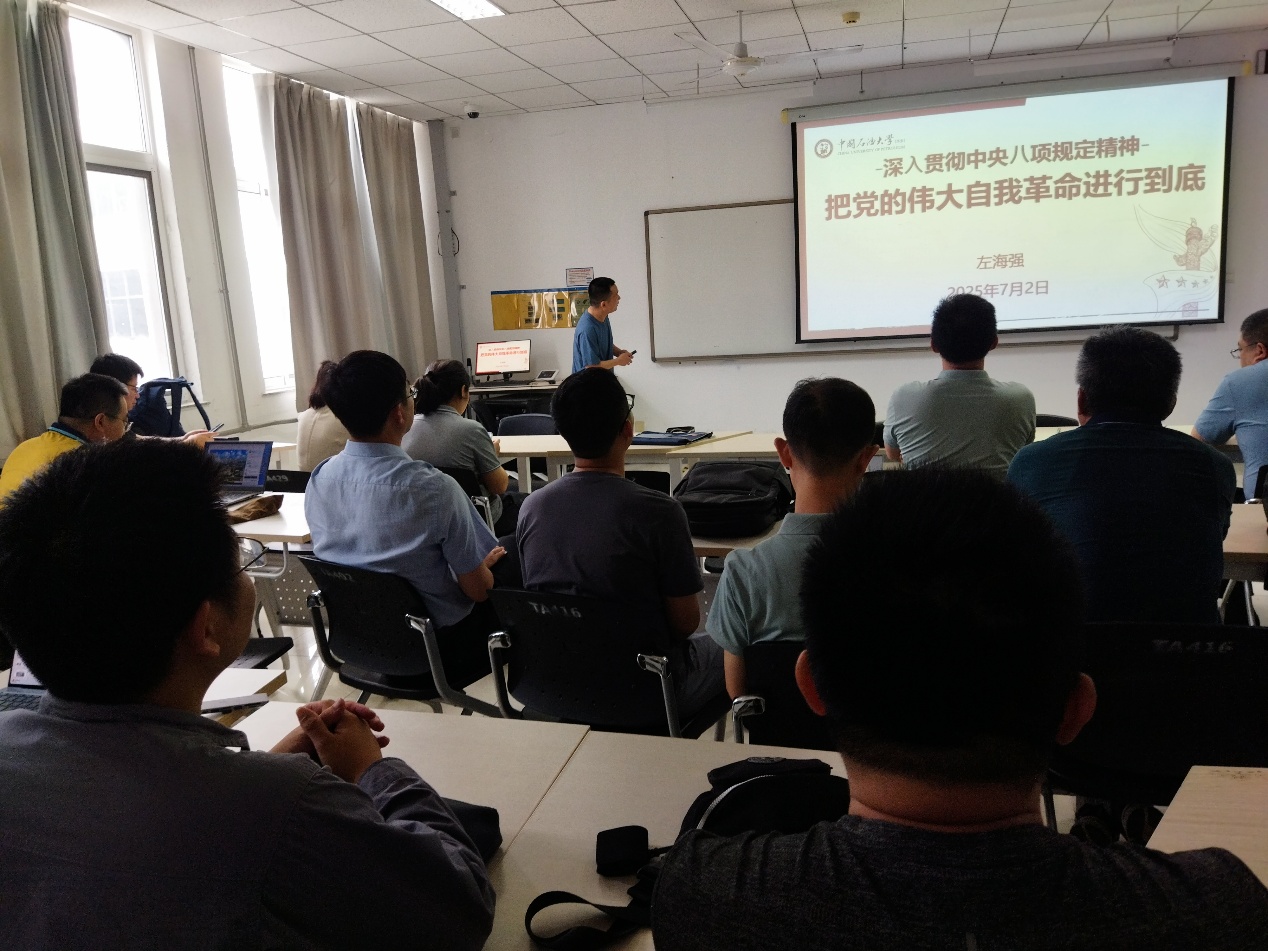 接下来,按照学校、公司党委关于持续抓好中央八项规定精神学习教育的部署安排,支部书记左海强主讲以“深入贯彻中央八项规定精神,把党的伟大自我革命进行到底”为题学习教育专题党课,他首先引用了中央纪委国家监委公布的 2025 年 5 月全国查处违反中央八项规定精神问题汇总情况,强调中央八项规定是长期有效的铁规矩、硬杠杠,近期要特别聚焦深入纠治违规吃喝、快递送礼、不作为乱作为、加重基层负担等问题,以铁的纪律狠刹歪风邪气。在新时代党的自我革命方面,党的十八大以来,党中央以前所未有的决心力度推进全面从严治党,解决了许多长期没有解决的顽瘴痼疾,管党治党宽松软状况得到根本扭转。自我革命是我们党跳出历史周期率的第二个答案,必须坚持把思想建设作为党的基础性建设,筑牢理想信念根基,拧紧世界观人生观价值观总开关。在落实中央八项规定精神方面,左海强详细解读了公职人员违规吃喝认定标准及关键因素,并列举了中纪委明确的 8 种禁止参加的饭局类型,提醒全体党员领导干部要时刻保持清醒,严格遵守相关规定。