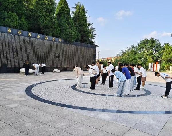 参观接近尾声,全体成员再次汇聚到革命烈士雕像前,三名员工代表手捧精心准备的花束,迈着沉稳的步伐走向雕像,将花束轻轻放置在基座两侧;全体人员脱帽肃立,默哀一分钟,现场静得只能听见微风声,每一位同学都在静默中缅怀先烈、感悟初心,让红色记忆深深烙印在心中。献花同学马伊莉感慨:“亲手把花放在雕像前时,看着花瓣轻贴基座,再想起参观时看到的先烈事迹,突然懂了今天的生活多来之不易,以后会更珍惜当下、努力向上。”学委曹芮恺则表示:“从合影时的敬意,到展馆里被先烈的旧物打动,再到见证献花的肃穆,让我明白‘铭记’不是形式。作为学委,我会把这份触动传递给更多同学,让英烈精神扎根心底。”