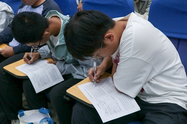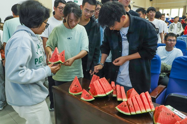 大会伊始,员工心理健康教育中心徐铭雪以“在不确定的世界里,选择拥抱变化”为题,引导新生重视心理健康,为新生逐步适应老员工活筑牢心理防线。心理宣讲结束后,大会氛围迎来温馨转折。辅导员张子良兑现军训期间对新生的承诺,分发饮品,同时为奖励员工在各项军训活动中取得的优异成绩,特别准备了新鲜西瓜,与新生共享荣誉喜悦。在班助有条不紊地切西瓜的过程中,辅导员张子良向新生介绍大学与高中的区别,讲解了需遵守的规章制度,同时结合学院发展与新生成长,鼓励员工积极参与校园活动,全面提升综合素养。随着会议接近尾声,新生们有序上前领取西瓜,在轻松的氛围中交流心得并依次离场。