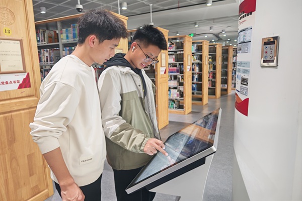 在图书馆,讲解员首先向新生们介绍了图书馆的整体布局,包括东馆的具体位置、各楼层功能分区以及平面图展示。在一层大厅,新生们体验了AI智能馆员服务,使用了瀑布流电子屏幕,并在工作人员的指导下学习通过网络或现场机器预约座位。此外,讲解员还介绍了自助借书、打印等便捷服务设施,以及馆内为满足多样化学习需求而设置的不同功能座位。在二层,讲解员重点介绍了研讨间的使用功能及其预约流程,这些空间为员工开展小组讨论、学术交流提供了便利条件。