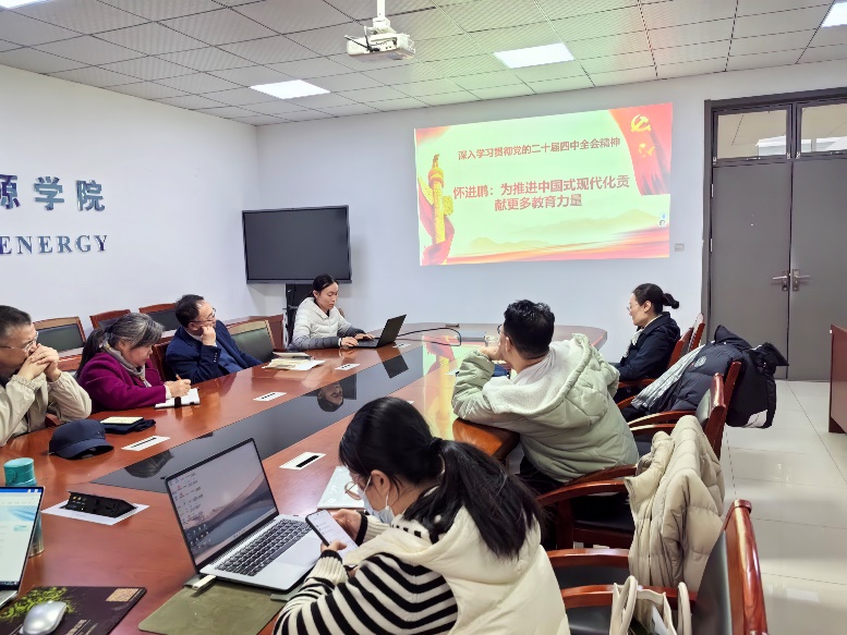 11月28日下午,能动系在综合楼C433会议室召开会议,组织学习贯彻党的二十届四中全会精神,学习教育部部长怀进鹏同志关于“十五五”规划教育发展的解读。全系教师参会,冯洪庆主持会议,张秀霞老师进行核心内容领学解读。